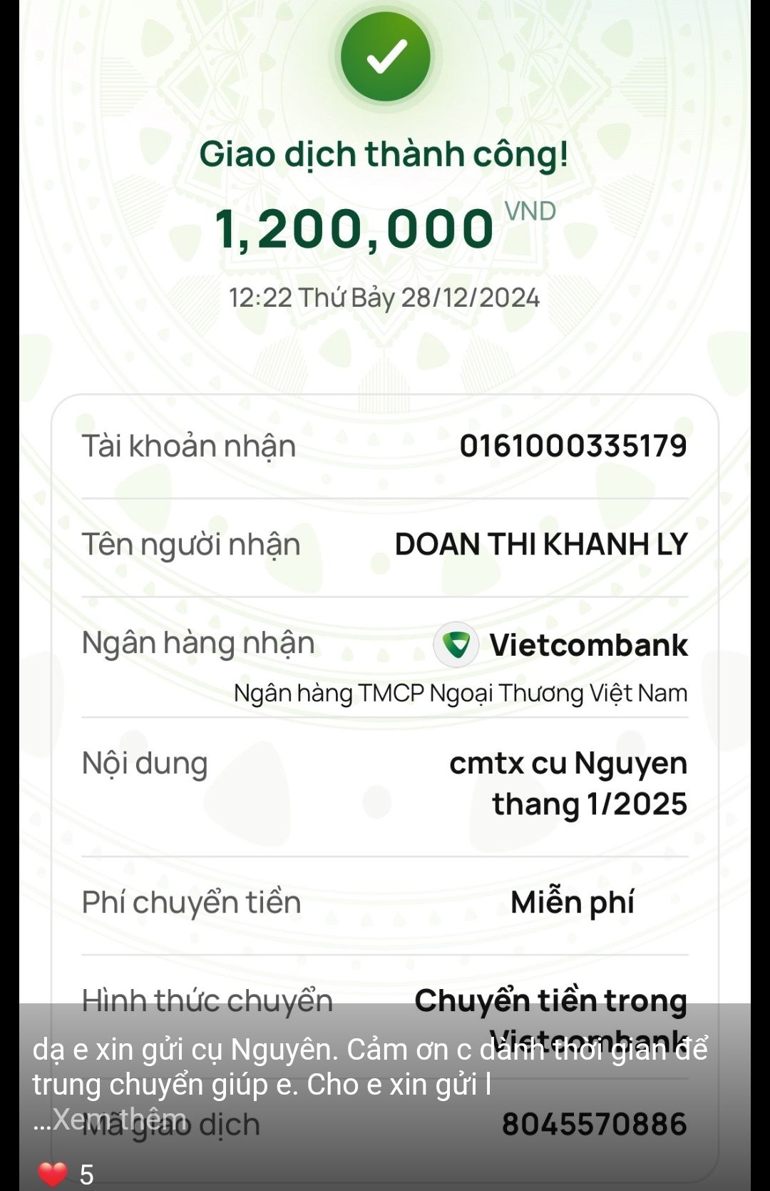 @Khánh Lý : Minh Nhật tiếp tục CMTX cụ Nguyên và đã chuyển tiền tới em rồi nhé.
