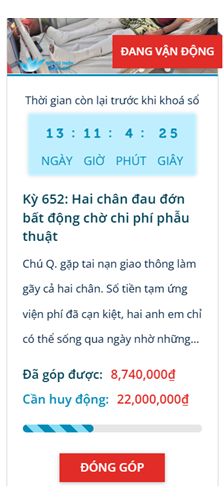 ·      Phần “Kêu gọi đóng góp” được thể hiện như Hình 1, phần này được thực hiện trong 1 khoản thời gian cụ                            thể và với 1 số tiền cụ thể. Khi hết thời gian kêu gọi hoặc đã nhận đủ số tiền cần huy động, phần này sẽ                          được đóng lại và gắn nhãn “Đã hoàn thành” như ở hình 2.