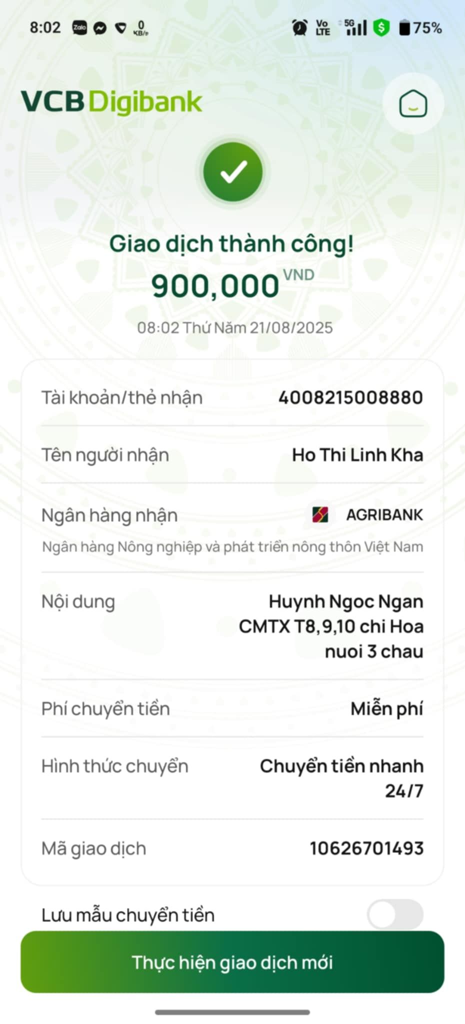 Gia đình gửi lời cảm ơn ạ! Hôm cô Kha đã nhận 900.000đ chia đều cho tháng 5,6,7 mỗi tháng 300.000đ