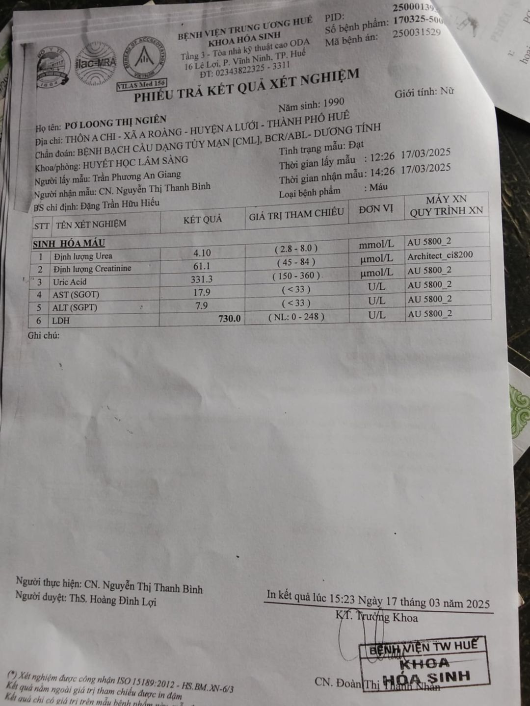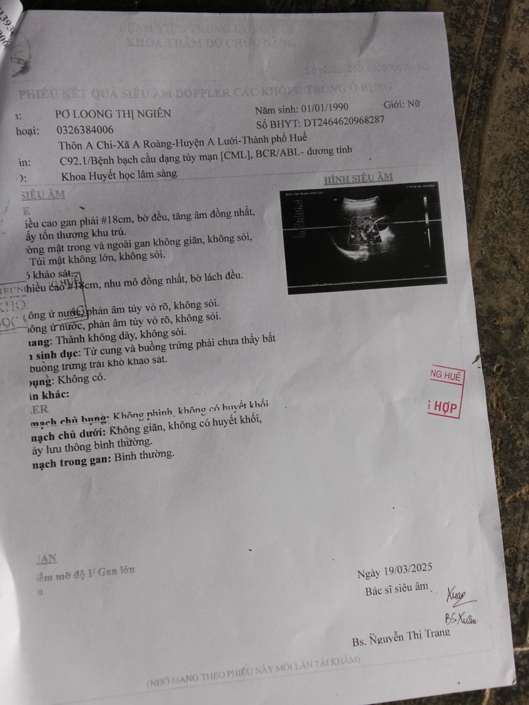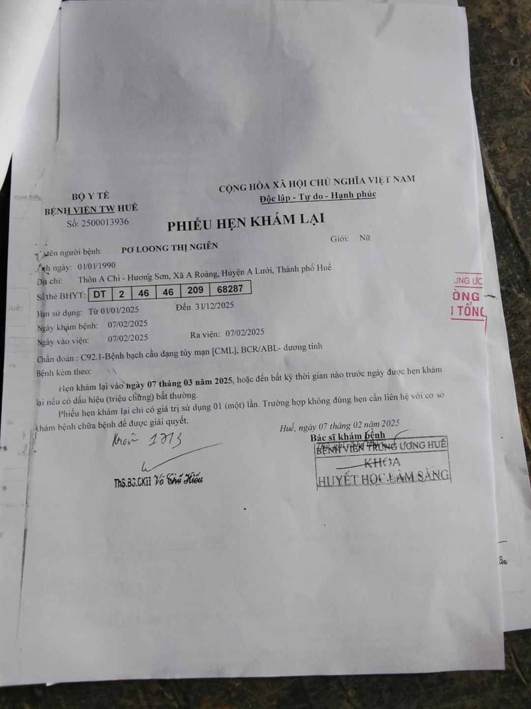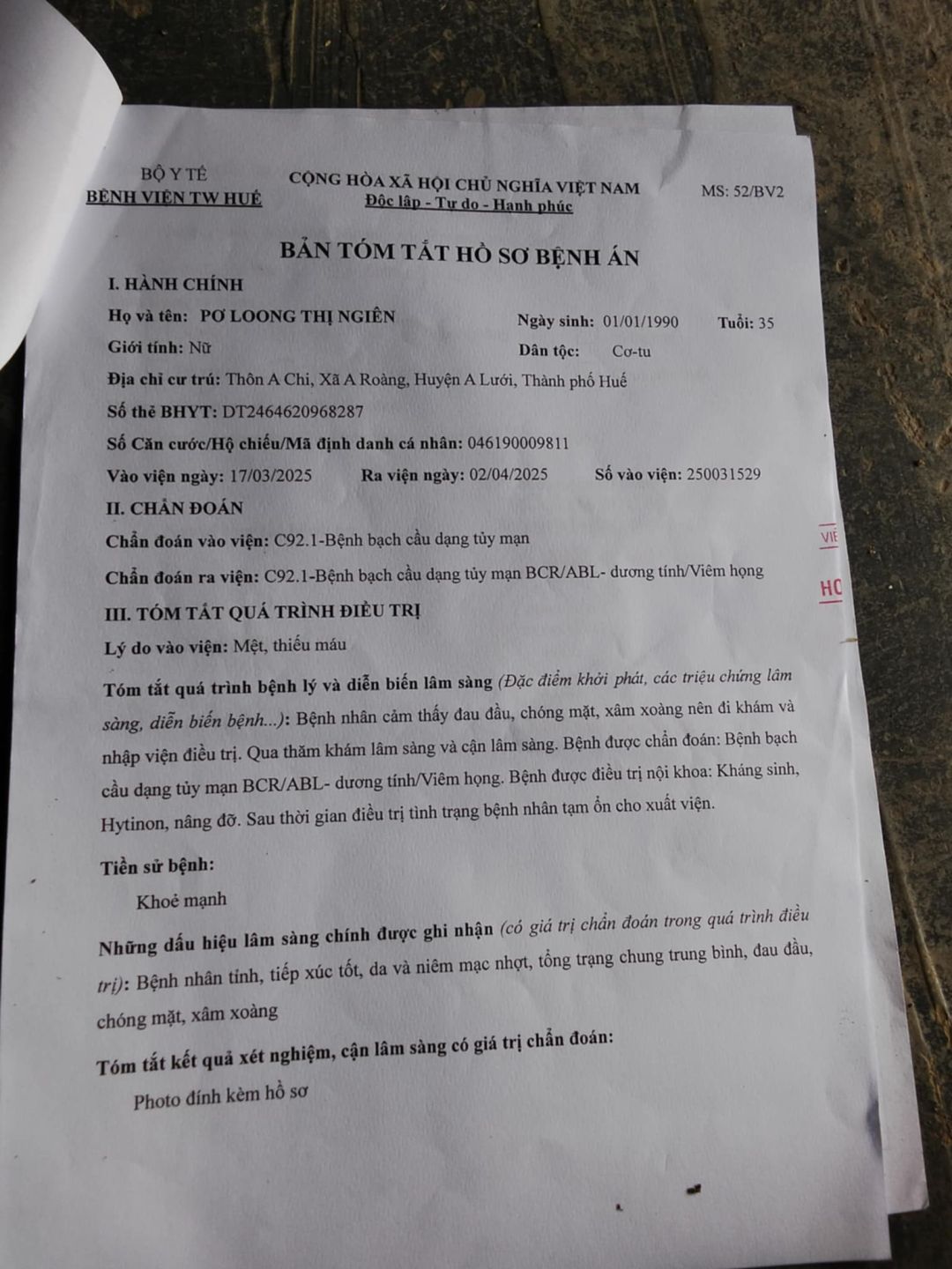 Chị đau từ ngày: 20/6/2021 bác sĩ phát hiện bệnh máu trắng, chị tại khám 2 tháng 1 lần trong 1 năm, mỗi tháng về tại khám, nằm viện 4 ngày. Giờ chị đau nặng từ ngày 23/6/2025 đến giờ. Gia đình thuộc diện hộ nghèo khó khăn.