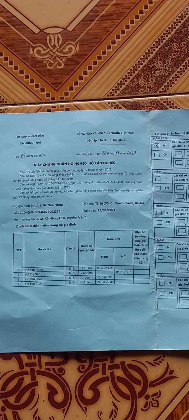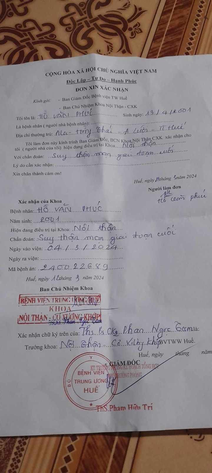 Đây là số điện thoại em Phúc 0362158303, hiện em đang nằm tại Khoa nội thận,cơ xương khớp BV TW Huế . Phúc sống chung với bố Hồ Văn Hùng sinh 1971, nghề nghiệp Nông dân ;mẹ Hồ Thị Nhỏ sinh 1975, nghề nghiệp nông dân; Vợ Hồ Thị Lăm sinh  1999 nghề nghiệp nông dân, con Hồ Đức Tuấn 2018 còn nhỏ .Vì Phúc ốm đau triền miên, nên bố mẹ Phúc thay nhau chăm sóc Phúc, vì thế thu nhập kinh tế không ổn định, trung binhf 1,5 triệu/ tháng, có lúc thì ít hơn vậy......Đau buồn , tủi hờn cho số phận của em Phúc khi chính người vợ của em đã bỏ đi từ tháng 02/2024 đên nay chưa thấy về...