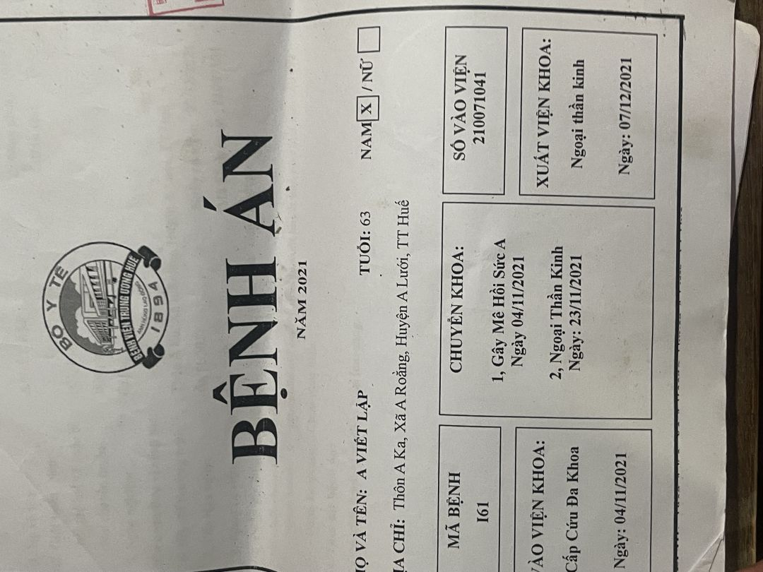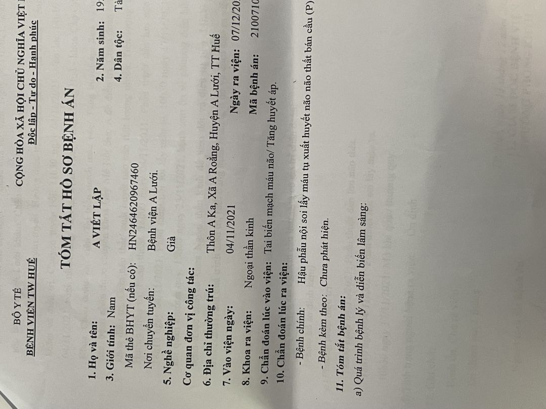 Ông Lập bị tai biến nằm liệt giường đã hơn 2 năm nay. Ông Lập sinh năm 1958, ông bị tai biến vào năm 2021. Khi người nhà phát hiện ông bị tai biến thì có đưa đi cấp cứu đến bệnh viện A Lưới và được bệnh viện chuyển đến bệnh viện Trung Ương Huế. Ông được bệnh viện chẩn đoán bị tai biến mạch máu não/tăng huyết áp. Sau đó bệnh viện cho ra viện và có giấy hẹn tái khám nhưng hoàn cảnh gia đình khó khăn không có kinh phí nên không thể đưa ông đến bệnh viện để tái khám được. Sau khoảng thời gian gần 1 năm không được tái khám thì ông bị biến chứng liệt tay phải. Từ lúc ông bị tai biến đến giờ thì ông không nhận được trợ cấp từ bất kỳ cơ quan tổ chức nào cả.