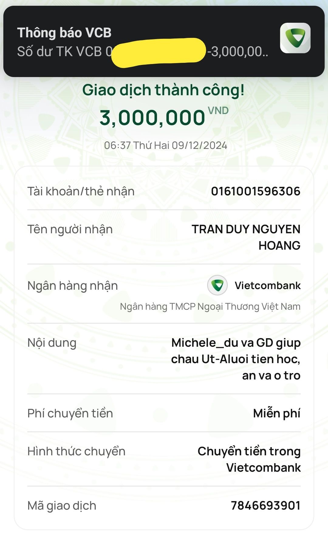 Michele_du và GĐ cũng đã chuyển tiền học phí cũng như tiền sinh hoạt, ở trọ tới thầy Hoàng rồi các bạn nhé.