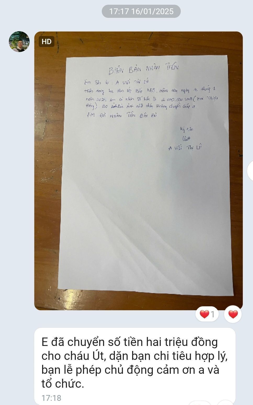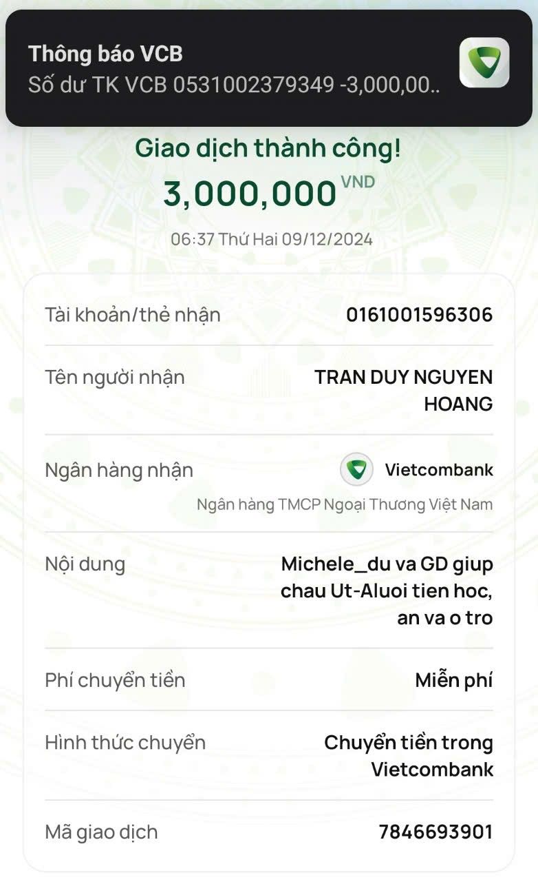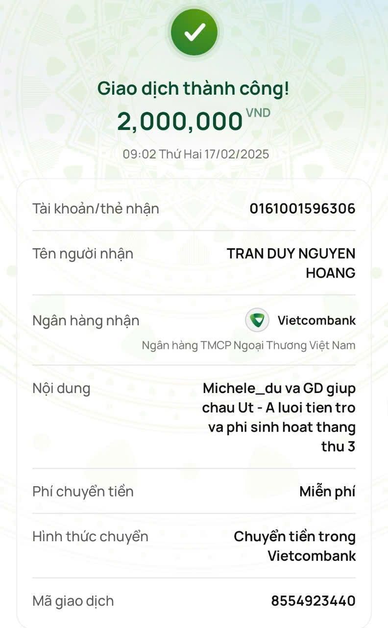 Michele_du cũng đã chuyển 2,000,000₫ tiền ở trọ cùng sinh hoạt phí tháng thứ 3 cho cháu ấy.