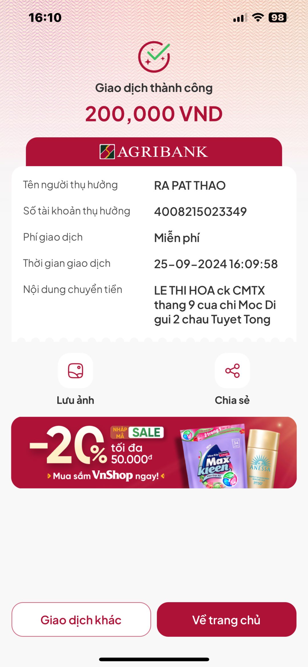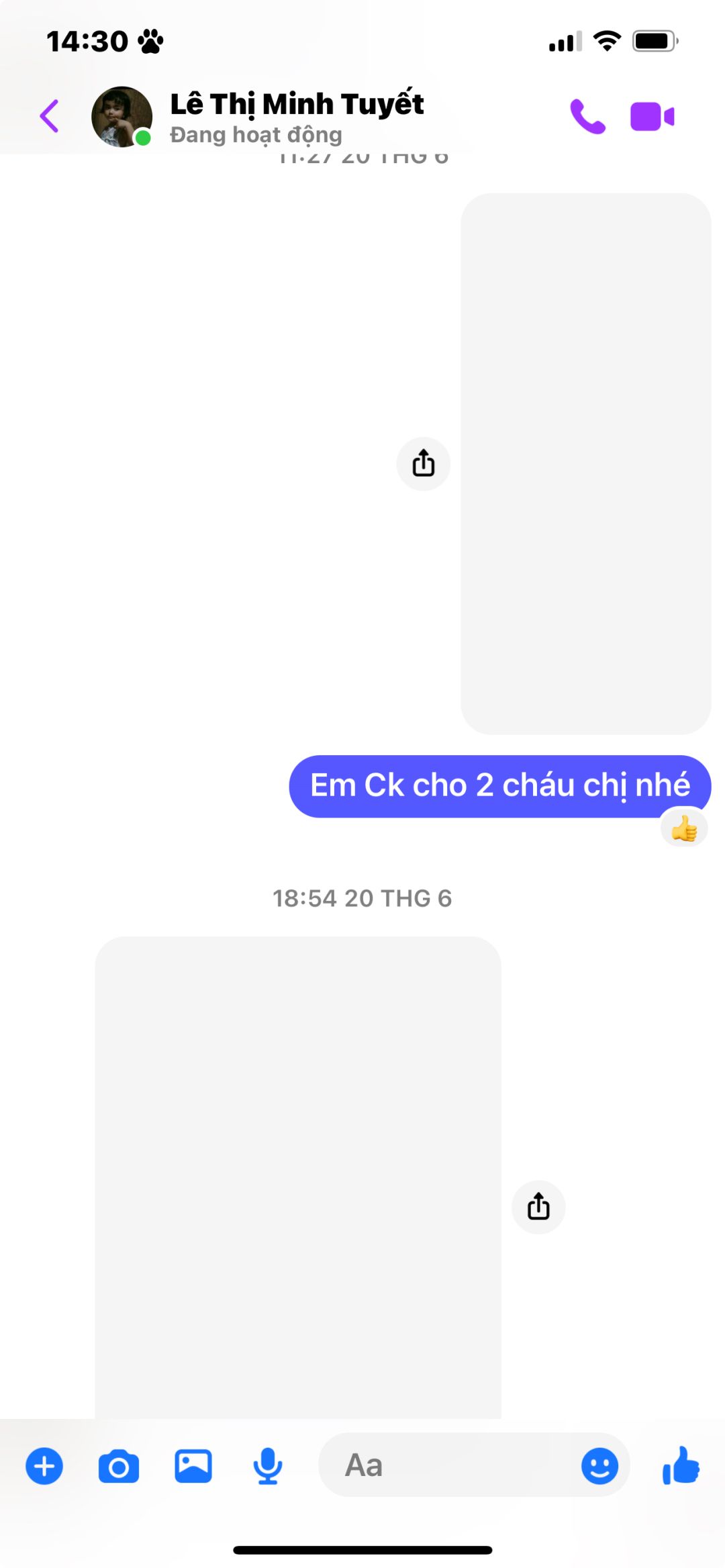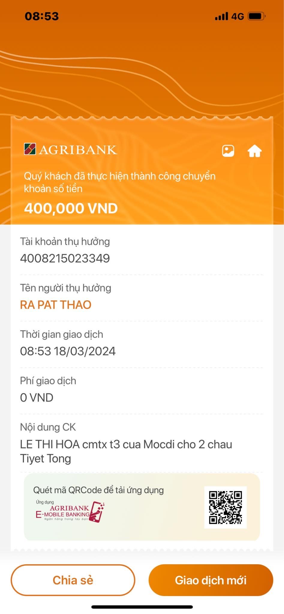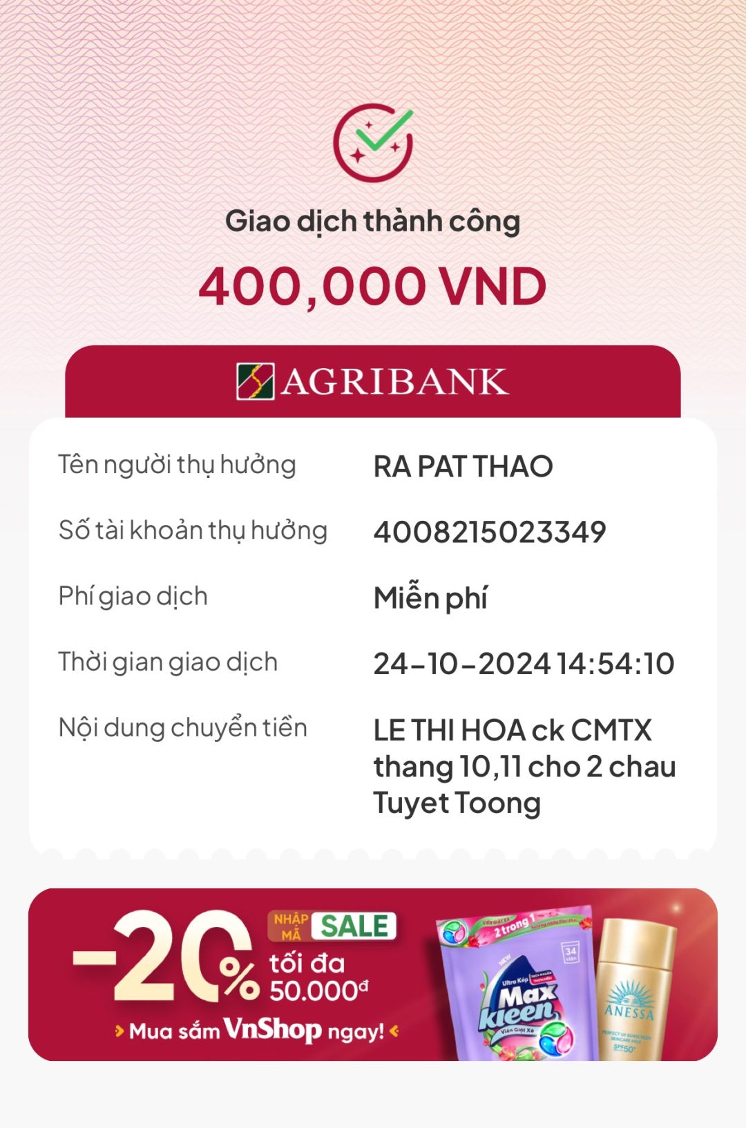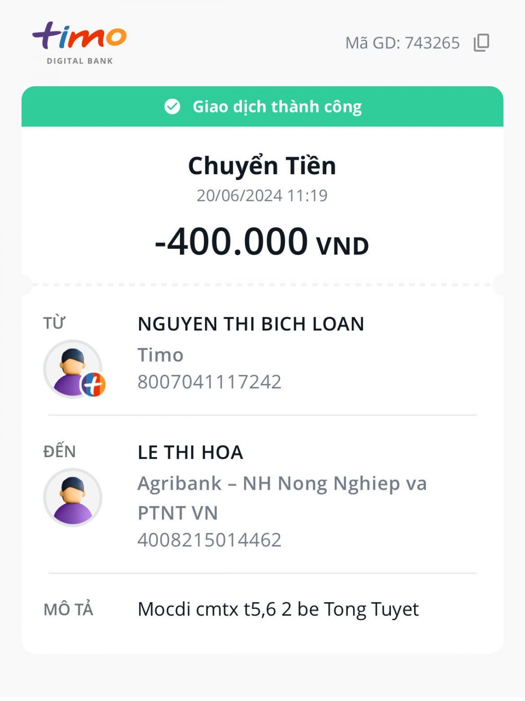 Loannguyen đã chuyển 400,000đ tiền CMTX T5,6 từ Mộc Di đến 2 cháu nhờ chị @Hòa Lê chuyển giúp nhé,