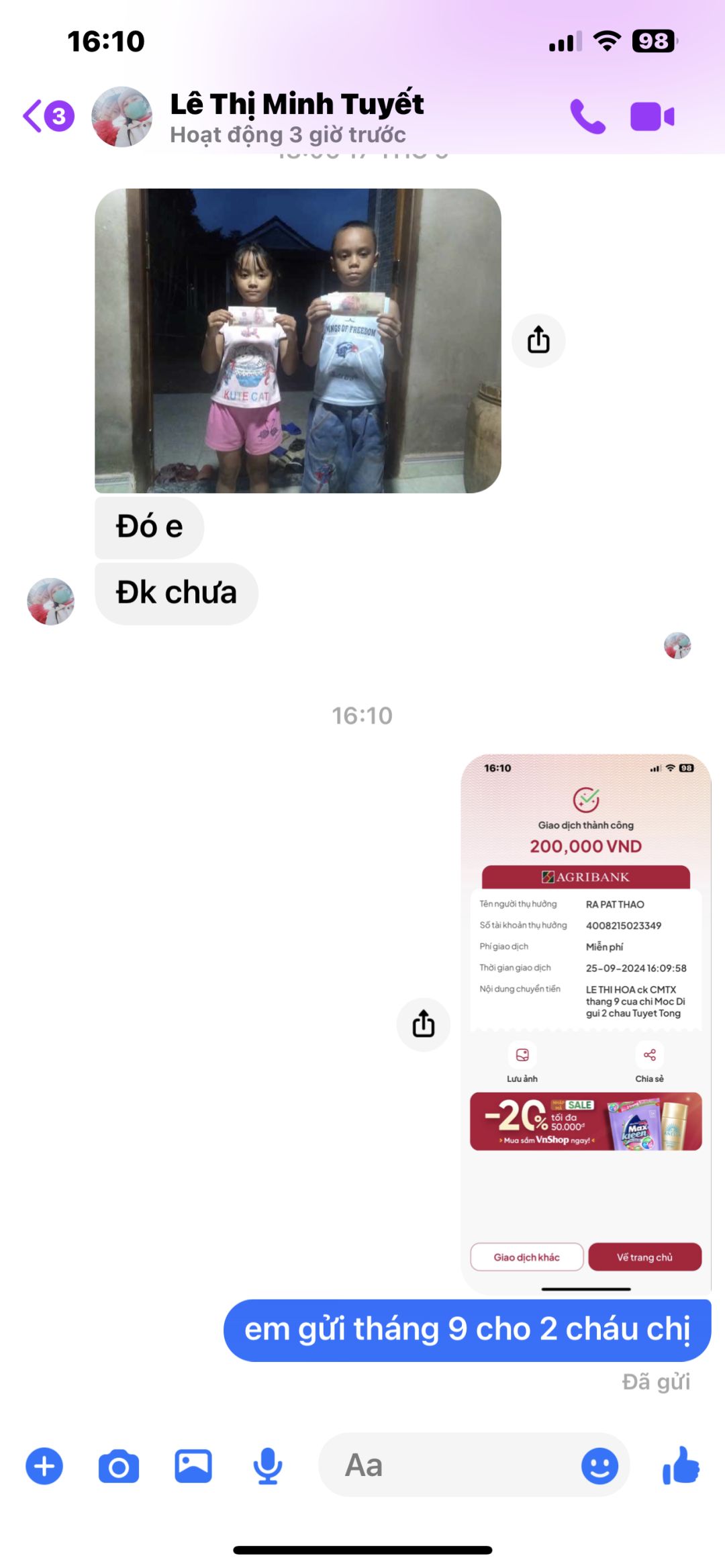 E đã nhận và trao cho 2 cháu Tuyết Tông số tiền 400k tháng 1,2 của chị Mộc Di giành cho 2 cháu. Cảm ơn tc của gđ chị Mộc Di và NTCM rất nhiều ạ