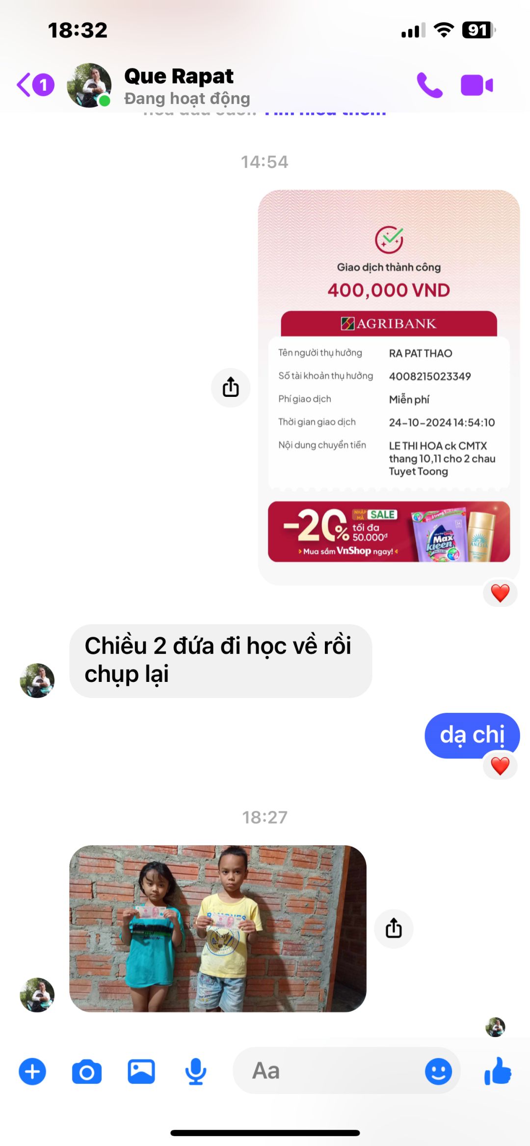 Ngày 18/03 em có chuyển 400,000đ là CMTX T3,4 cho hai bé, nhờ chị chuyển giùm tới 2 bé giúp em nha. Tks chị nhé !