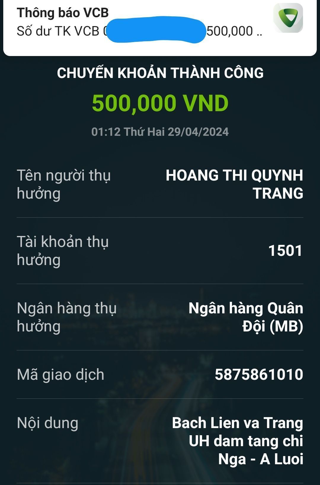 Mọi sự hỗ trợ xin gửi về SỐ TK NTCM: 1501_ HOÀNG THỊ QUỲNH TRANG _ Ngân hàng MB.