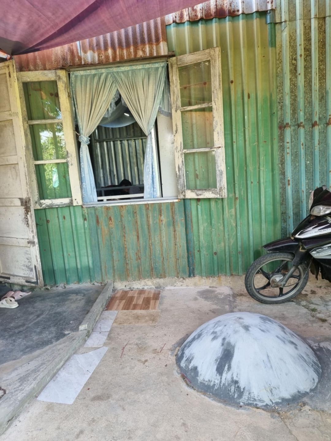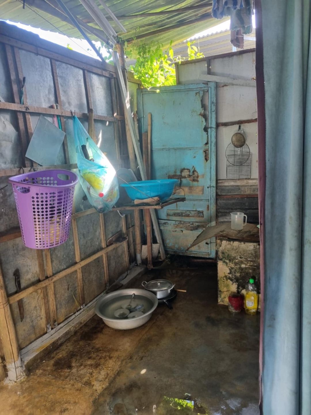 Gia đình thuộc hộ nghèo, căn nhà được lắp dựng bằng đủ thứ có thể “nhặt” được hoặc mua rẻ khi anh làm công trình dựng trên bìa ruộng rìa xóm.