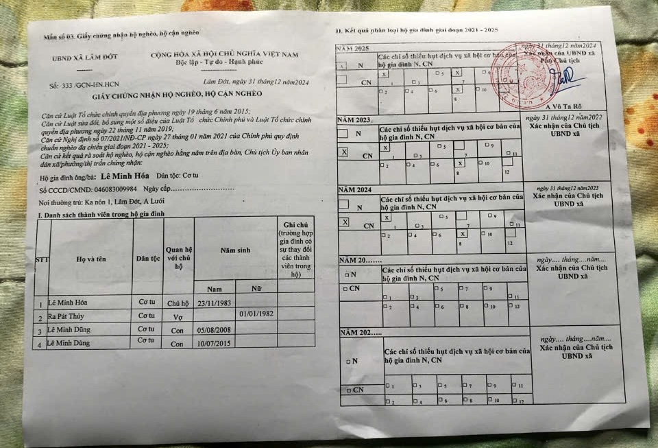 "Hoàn cảnh của anh Lê Minh Hoá, sinh ngày 23/11/1983, trú tại thôn Ka Nôn 1, xã Lâm Đớt, huyện A Lưới, thành phố Huế. Anh Hoá hiện tại đang sống với vợ và hai đứa con. Vợ anh tên là Ra Pát Thị Thủy, sinh năm 1982, nghề nghiệp làm ruộng, không có thu nhập khác; đứa con đầu tên là Lê Minh Dũng, sinh năm 2008, đang đi làm thuê ở Sài Gòn; đứa con sau tên là Lê Minh Dung, sinh năm 2015, đang học lớp 4.