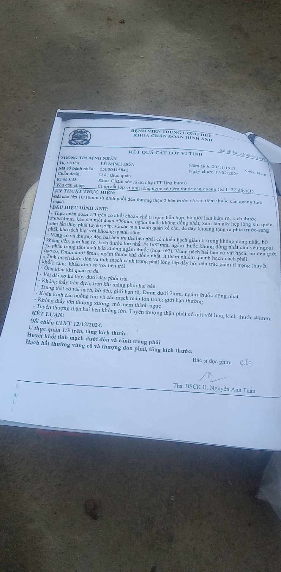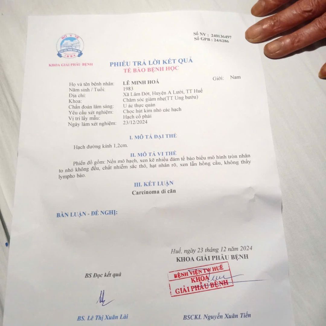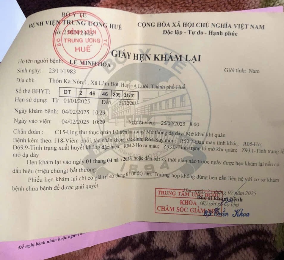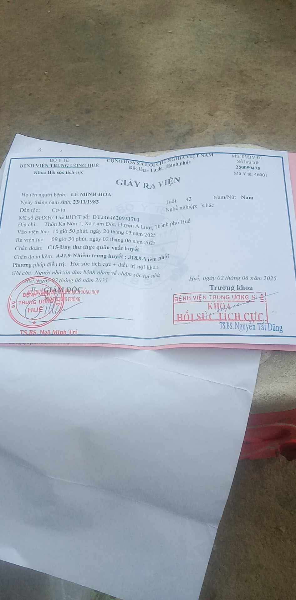 Anh Hóa nằm viện từ tháng 11 năm 2024, giờ anh đã được về nhà chăm sóc, hiện tại anh không có tiền để đến bệnh viện Trung ương Huế để điều trị tiếp, gia đình chạy vay nhiều nơi nhưng không được."