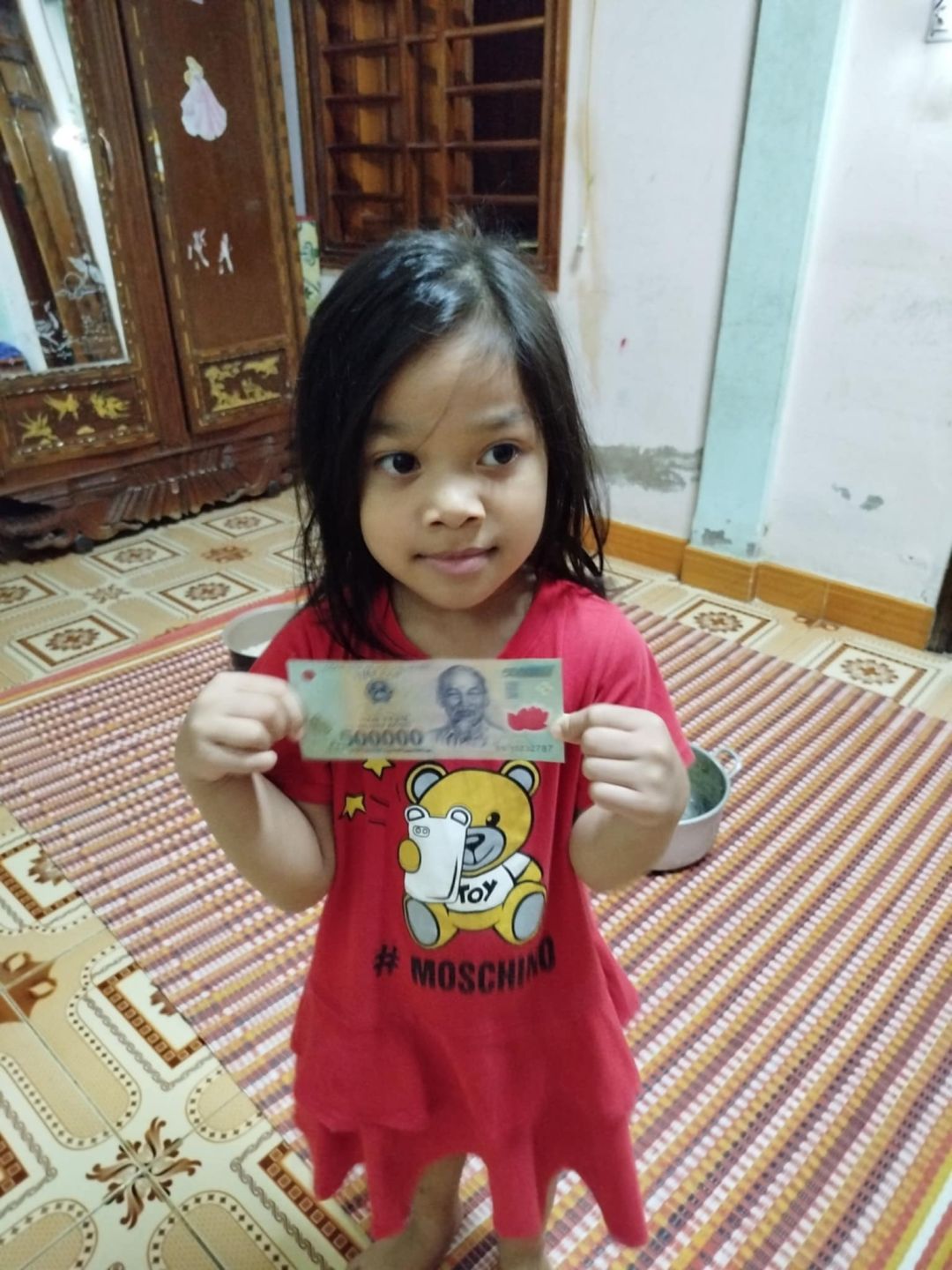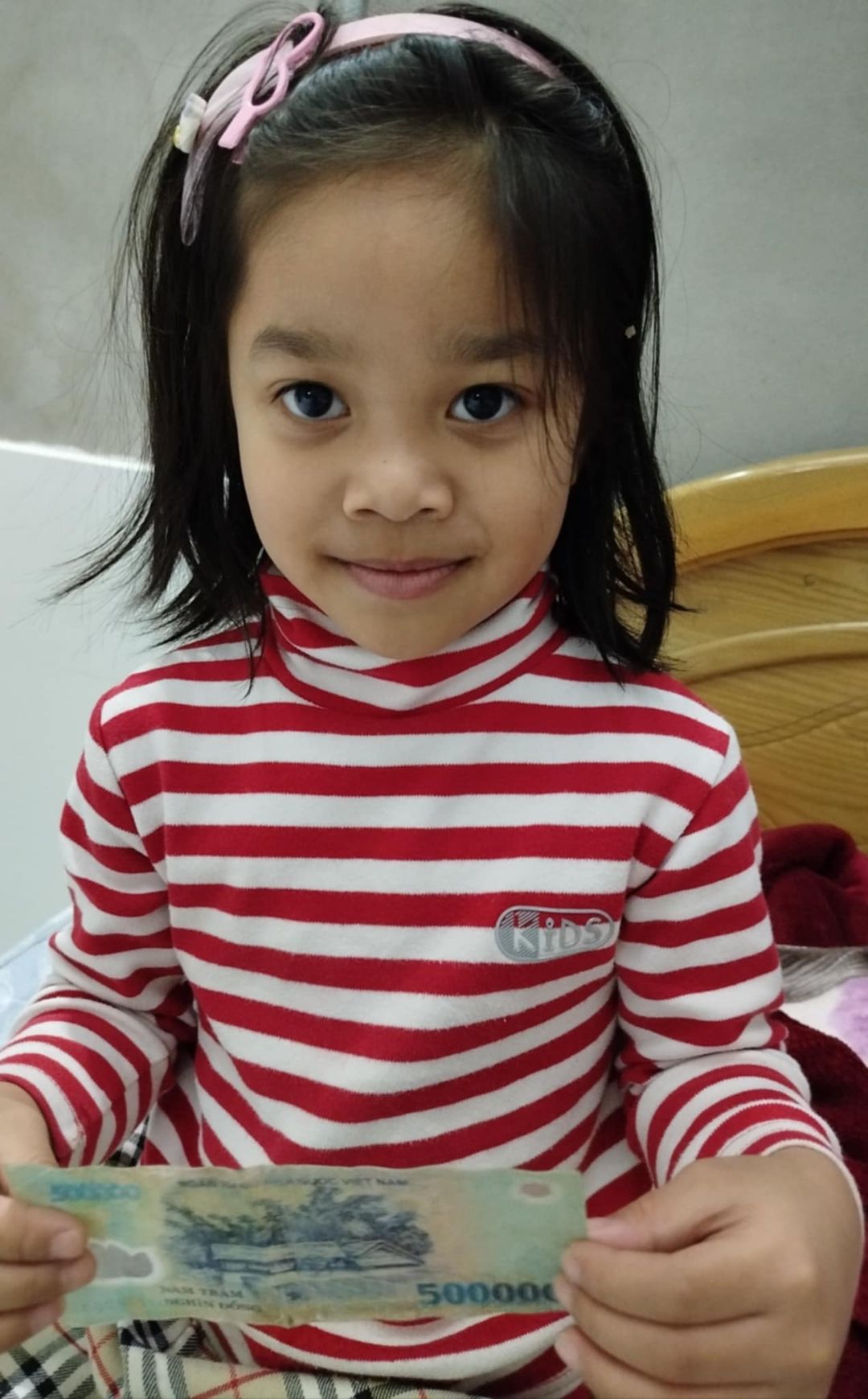 Em đã trao 200.000 đ tới cháu Khánh Băng. Theo thông tin từ mẹ cháu, hiện cháu đã đi học mẫu giáo lớn, nhưng phải đem theo nhiều quần nhờ các cô hỗ trợ thay vì đi ngoài lắc nhắc mất kiểm soát. Cháu vẫn phải uống thuốc hàng tháng theo đơn và đa số mua ngoài do điều kiện đi viện xa nên không đi đều được.