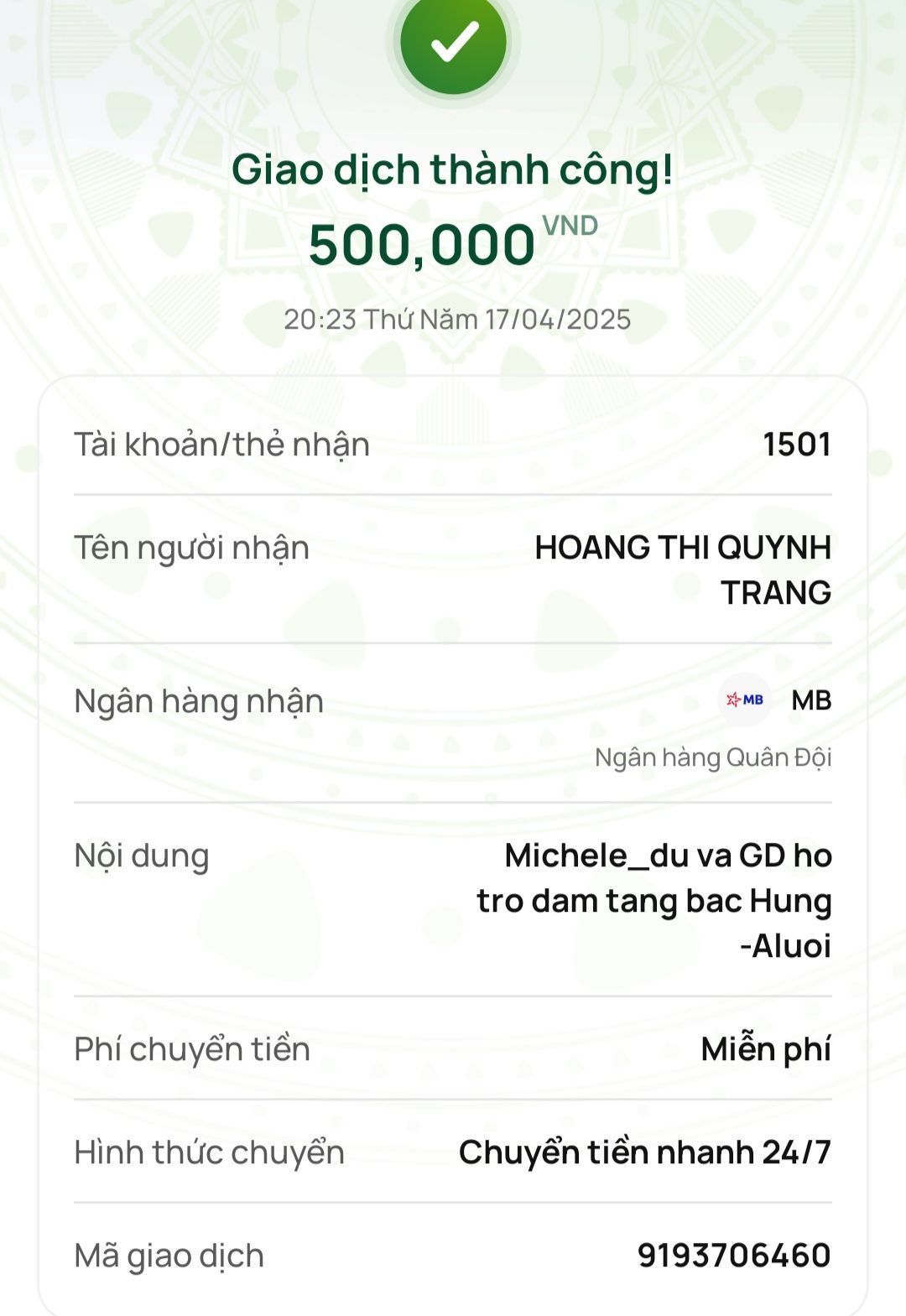 Michele_du và Gia đình ủng hộ đám tang của bác Hùng 500,000₫
