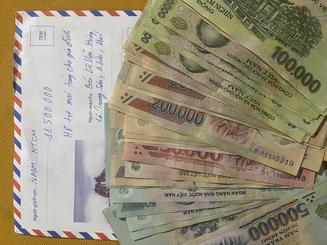 Hai người bạn của em Pi Riu Thế đưa tiền mặt là Ngọc Mei 100k, cô giáo Khánh Toàn 200k