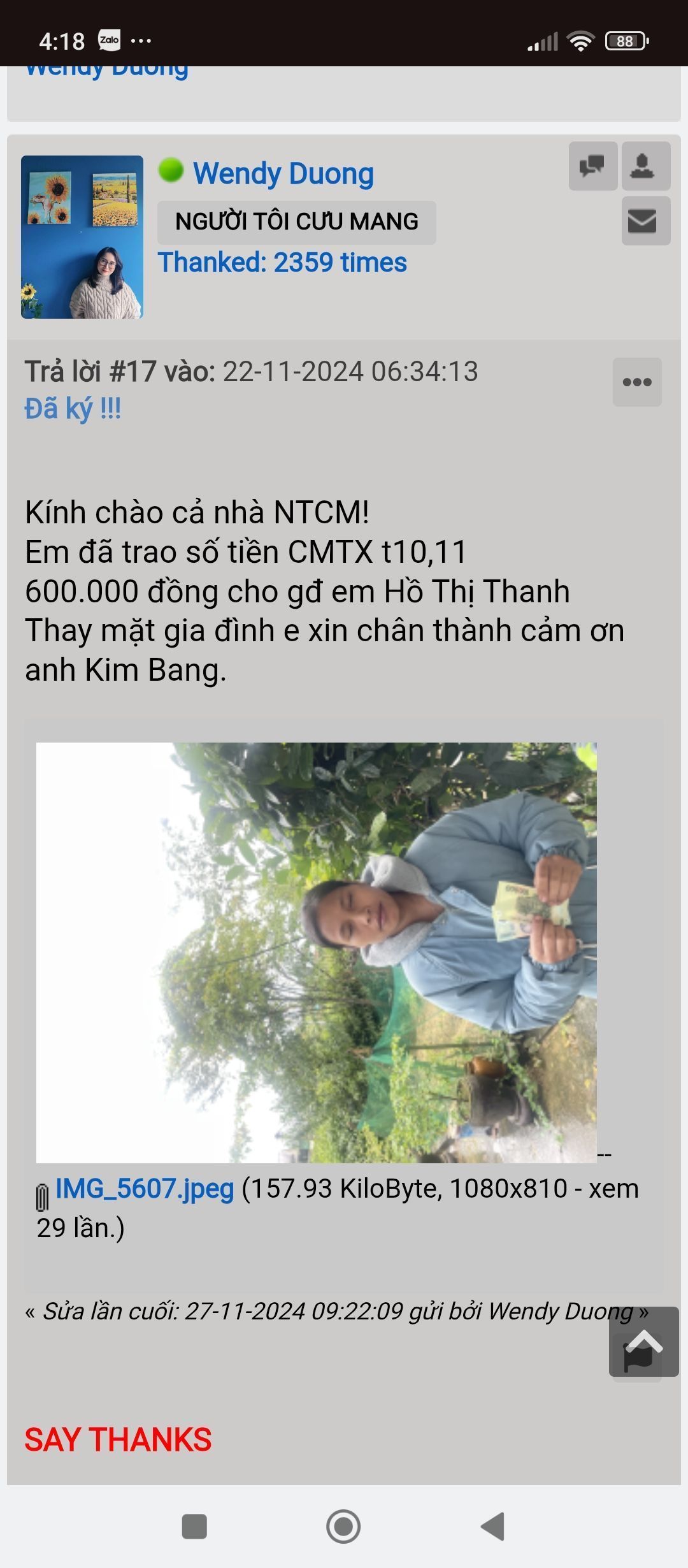 Em đã trao số tiền CMTX t10,11 1 triệu đồng cho gđ em Hồ Thị Thanh