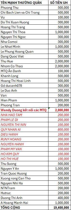 Theo thống kê của Loannguyen thì đến chiều ủng hộ 19.400.000đ + 2.000.000đ phúng điếu người thân thành viên. Quỹ đã chuyển 21.400.000đ cho bạn Blup Thin, nhờ bạn kiểm tra và gửi gia đình giúp.