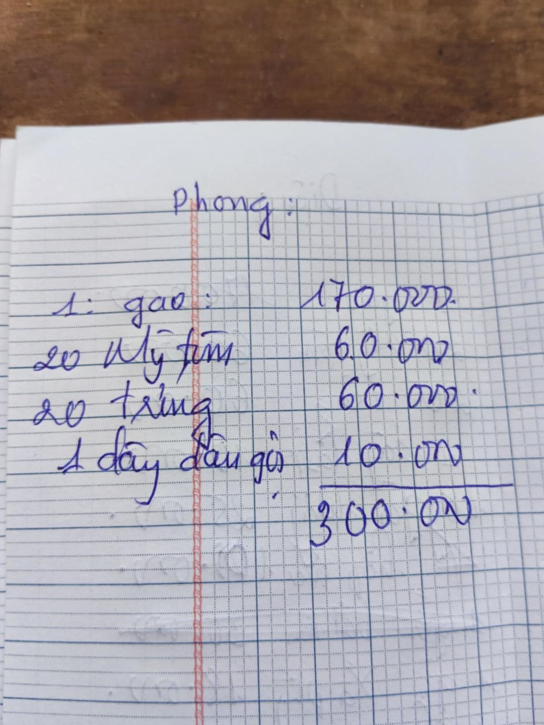 400. 000 đ thực phẩm(trứng :100.000đ, mì 100. 000đ , gạo 180.000 đ)