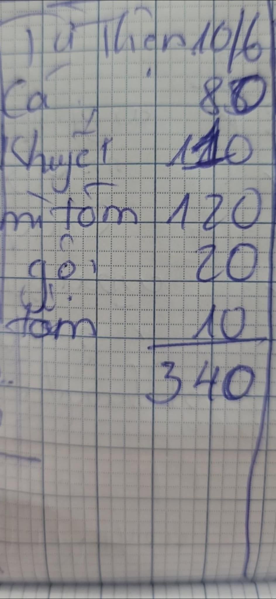400. 000 đ thực phẩm( gia vị 100.000đ, cá 100.000 đ, khuyết 50.000 đ,trứng :100.000đ, mì 50. 000đ  ) 100.000 đ tiền mặt
