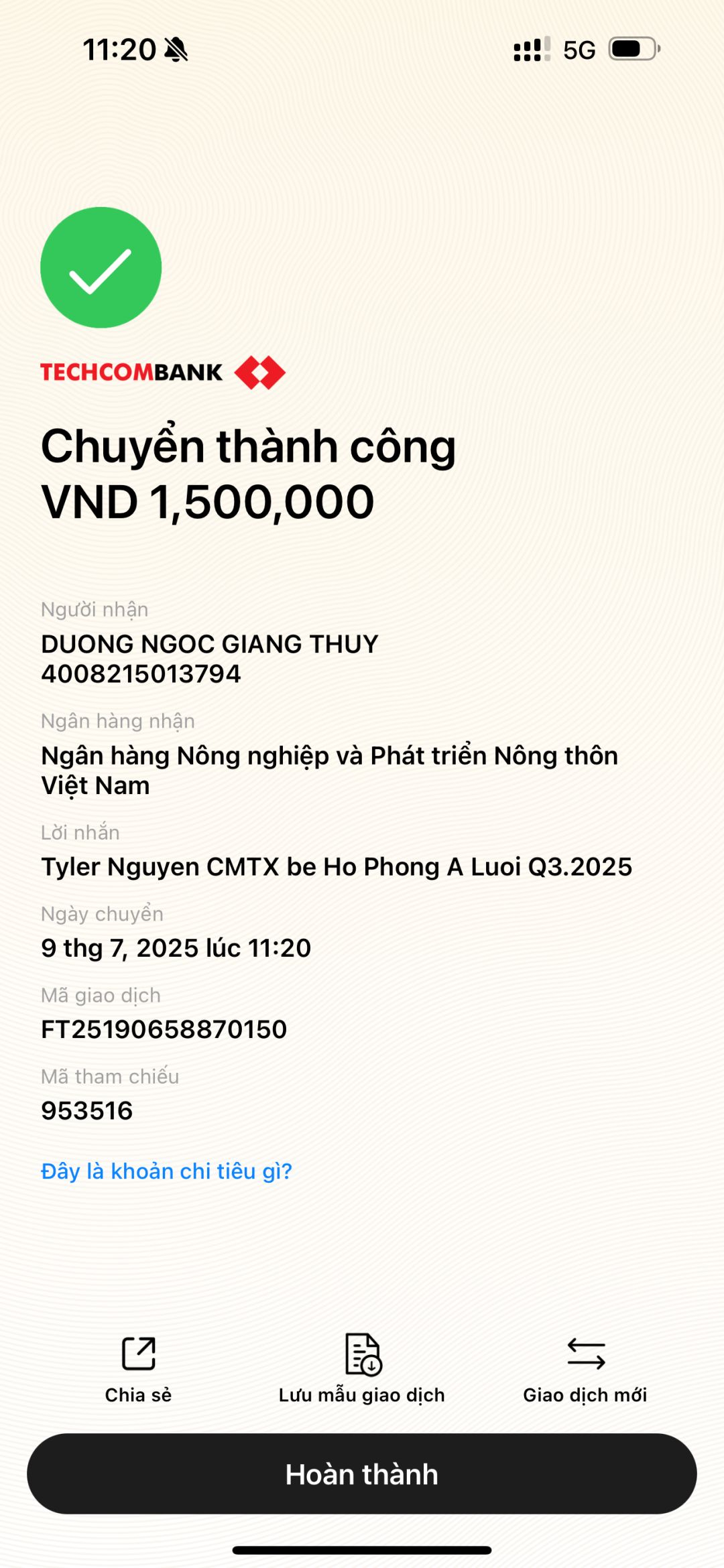 Chú Tyler Nguyen tiếp tục giúp đỡ cháu. Số tiền CMTX Q3/2025 đã được chuyển khoản.