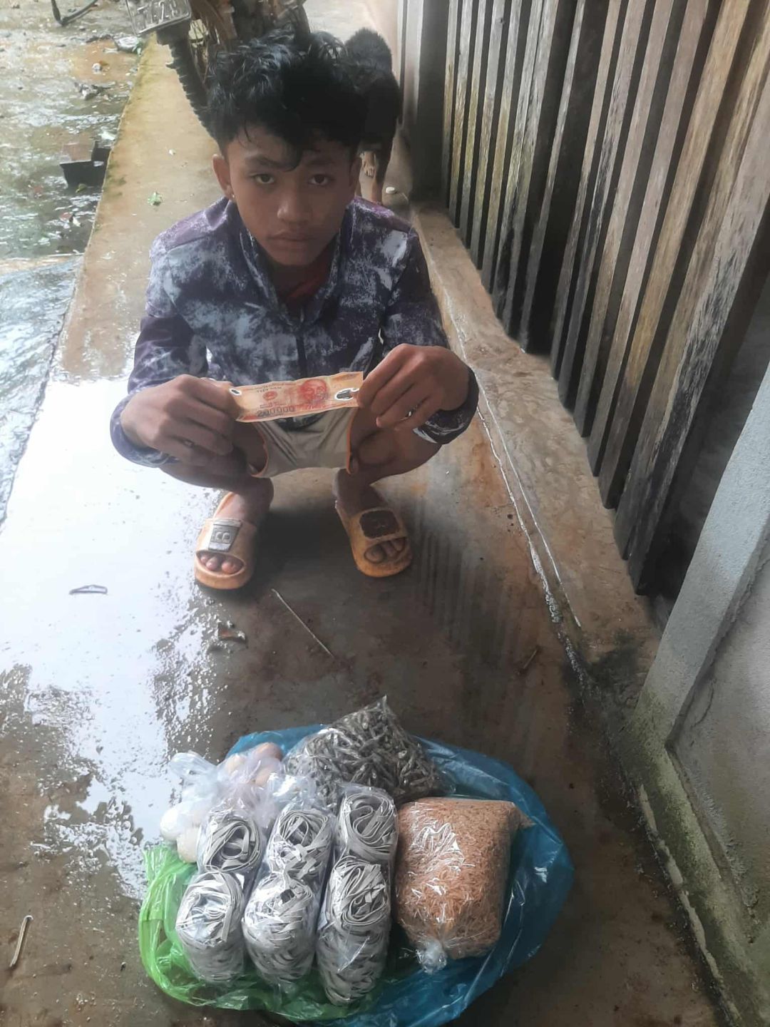 400. 000 đ thực phẩm( thịt hộp, kem đánh răng: 50.000đ, cá 75.000đ,  giấy vs 75.000 đ,trứng :100.000đ, mì 100. 000đ  ) 100.000 đ tiền mặt