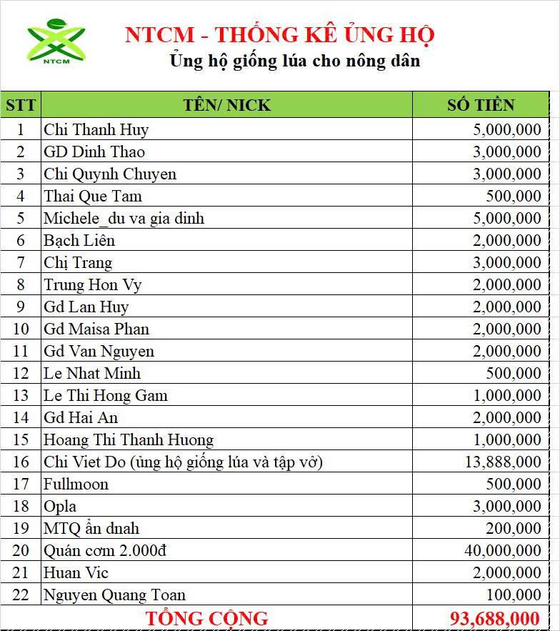 Ngoài ra, nhà cung cấp lúa ủng hộ 50kg lúa; Nhóm anh Thành, anh Hải, Ivy áo cưới ủng hộ 50kg lúa; Địa phương ủng hộ phí làm banner.