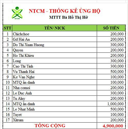 Căn cứ theo thống kê từ @Pi Riu Thế sự ủng hộ là 4,500,000₫. Nếu như không có khoản tiền ủng hộ nào thêm thì chúng ta sẽ xuất quỹ NTCM để hỗ trợ 1,500,000₫ cho đủ 6,000,000₫ các bạn nhé.
