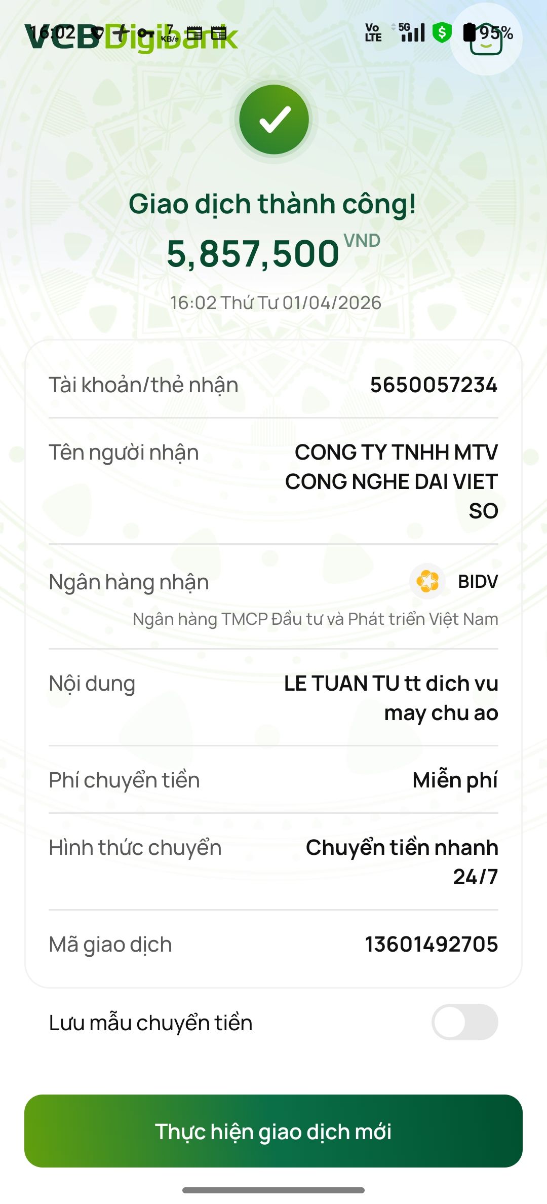 Thủ quỹ chuyển nhầm qua letuantu, letuantu đã chuyển cho bên phía công ty rồi ạ.