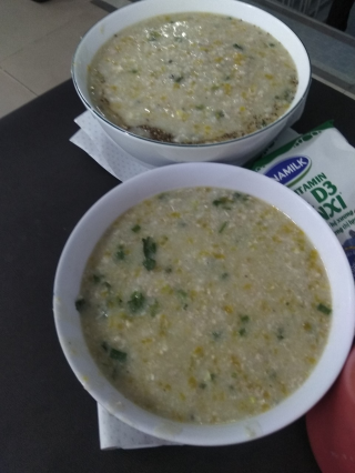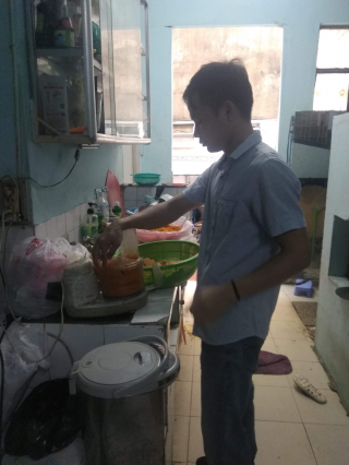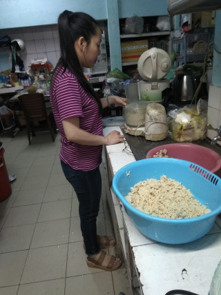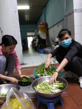 Từ sáng sớm, anh chị tập trung tại nhà chú sáu, để nấu cháo. Rồi mỗi người đóng góp một chút kỹ năng để phụ nấu cháo. Tôi thì phụ trách nhặt hành, lựa hành. Tôi cảm thấy hứng thú, vì đã lâu lắm rồi tôi mới có dịp vào bếp núp. Đây cũng là một trong những sở thích của tôi lúc rảnh. Còn anh chị khác phụ trách bổ bí, say bí. Hôm nay, tôi đặc biệt ấn tượng với 1 thành viên với kỹ năng mài dao điêu luyện, chị ý khiến tất cả thành viên phải trầm trồ "Ồ".