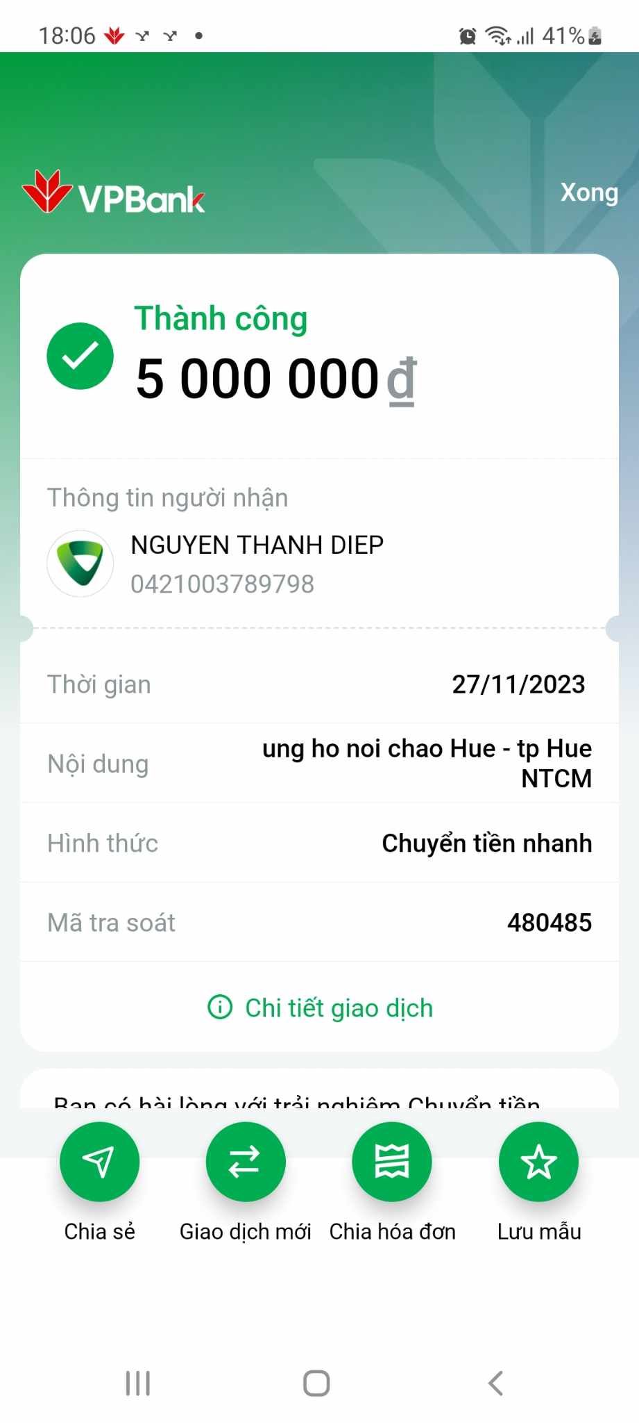 Cảm ơn anh Sáu đã hỗ trợ khoản thiếu nợ đi chợ của nhóm NTCM tại nồi cháo Huế. Anh chuyển thẳng lại vất vả cho chị em rồi.