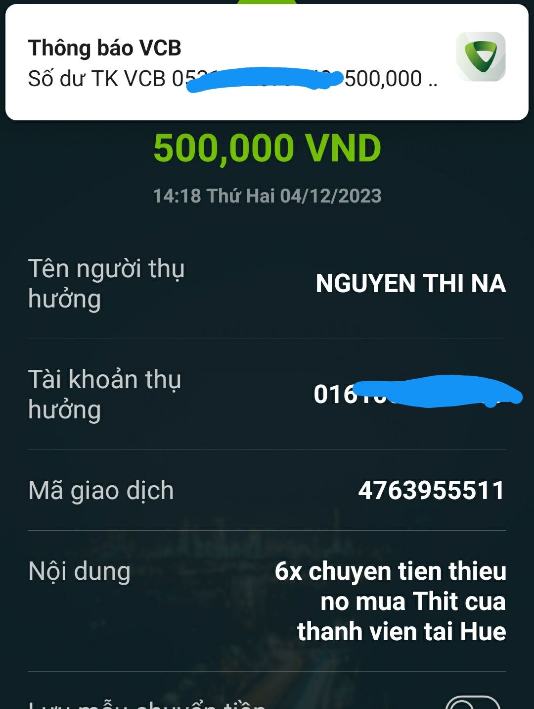 6x đã chuyển tới @comay_a2n 500,000₫ để bạn ấy thanh toán khoản tiền mà thành viên nồi cháo Huế thiếu nợ tiền mua thịt từ rất rất lâu rồi.