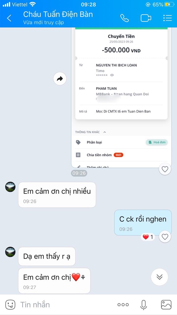 Loannguyen đã chuyển 500,000đ tiền CMTX tháng 8 từ Mộc Di cho cháu Tuấn.
