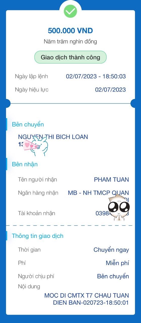 Loannguyen đã chuyển 500,000đ tiền CMTX tháng 10 từ Mộc Di cho cháu Tuấn.