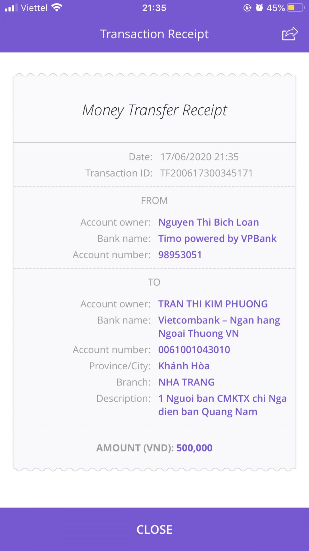 Số TK Thỏ chuyển phía trên bị thiếu số nên sẽ return  , vậy  Thỏ chuyển lại theo thông tin dưới đây nhé :
