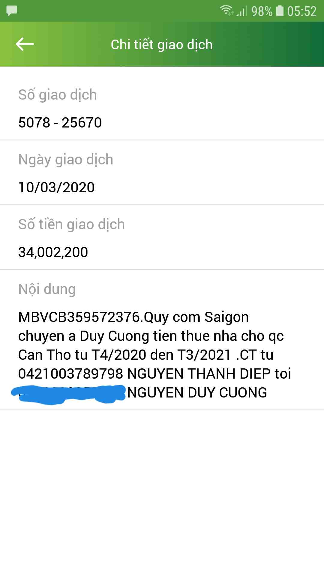 - 34,000,000đ tiền thuê nhà vào tài khoản của bạn Cường.