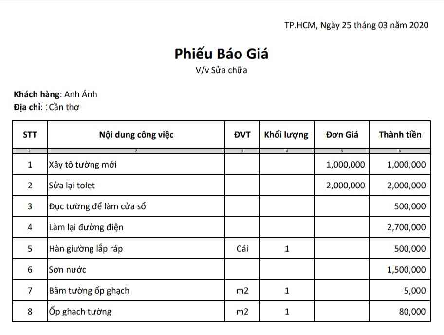 Dưới đây là bảng báo giá thi công sửa chữa nhà cho Quán Cơm 2000đ-Cần Thơ.