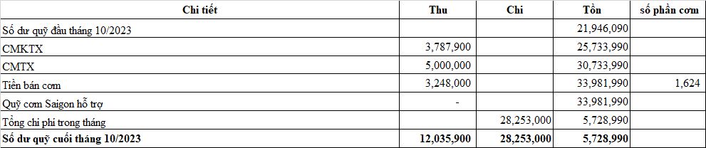 Chào cả nhà !Theo Báo cáo Quỹ Quán cơm 2000đ Cần Thơ cuối tháng 12/2023 còn tồn số tiền 1,047,990đ.Mong TĐP duyệt chi hổ trợ từ Quỹ Quán cơm 2000đ SG để hoạt động quán cơm Cần Thơ không bị gián đoạn.https://nguoitoicuumang.com/index.php?topic=90351.0Xin cảm ơn sự chung tay của cả nhà ! Cảm ơn TĐP !
