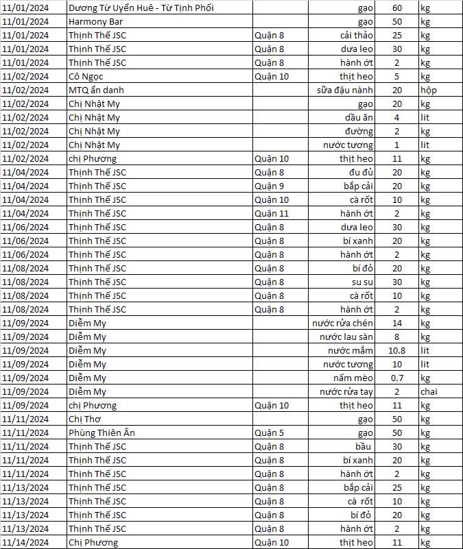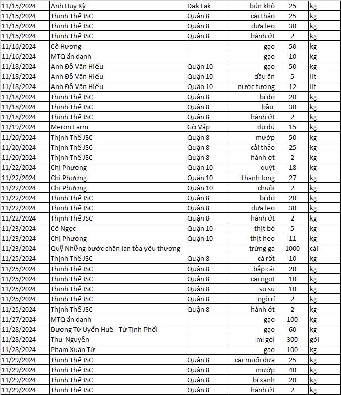 Cập nhật ủng hộ hiện vật của quán cơm tháng 11/2024