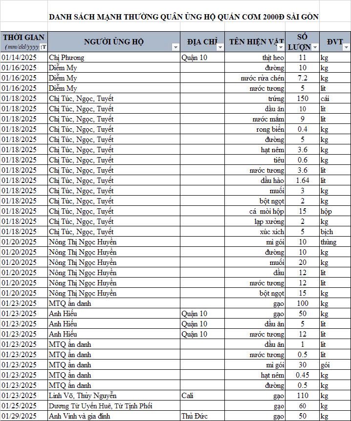 Cập nhật ủng hộ hiện vật của quán cơm trong tháng 01/2025.
