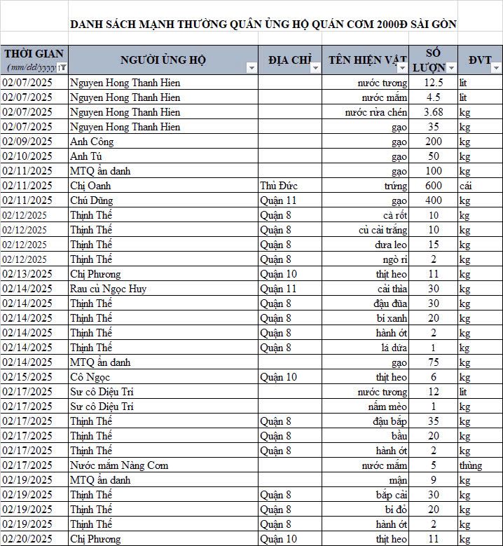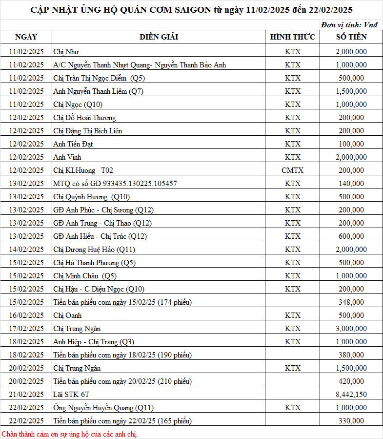Quỹ cơm Saigon đã nhận: (từ ngày 17/02/2025 đến 23/02/2025)