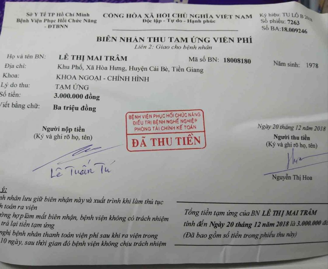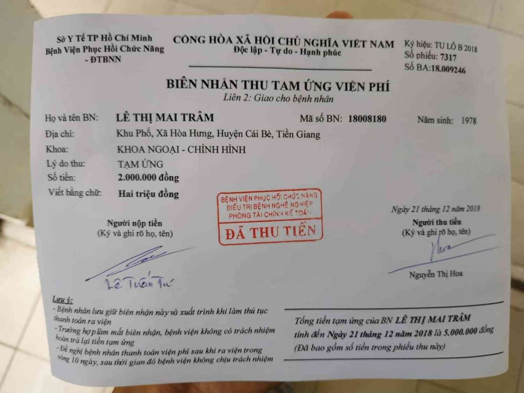 Ngày 21/12/2018. Mai Trâm lên ca phẫu thuật thì phòng mổ kêu Đống tạm ứng thêm 2tr.