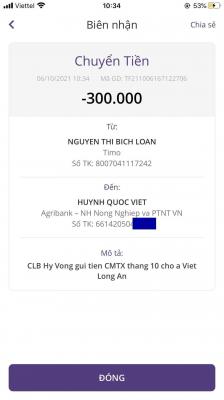 Loannguyen đã trung chuyển 300,000đ CMTX tháng 10  từ CLB Hy Vọng đến TK anh Việt rồi ạ !
