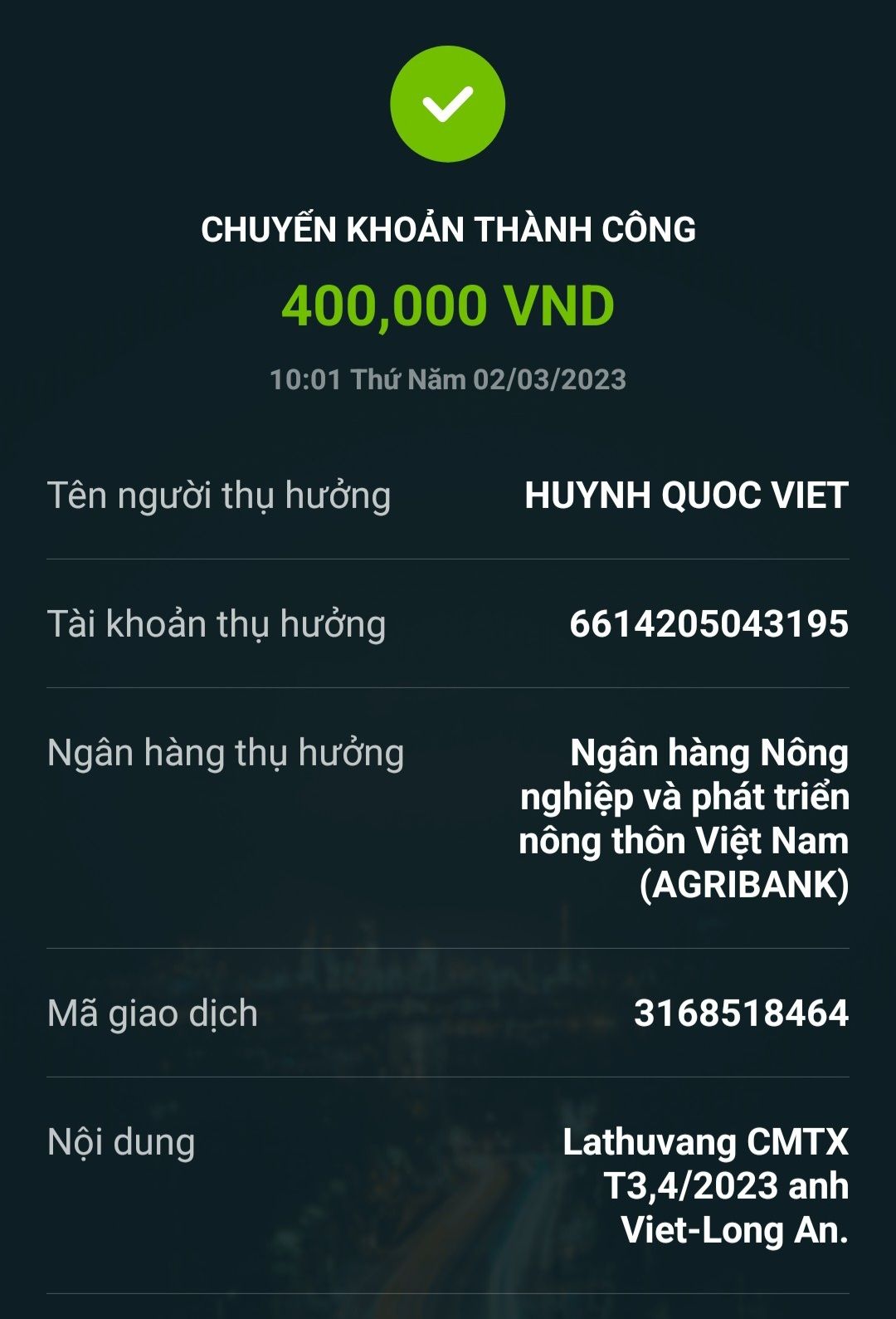 Lathuvang đã chuyển tk anh Việt CMTX T3,4/23 .