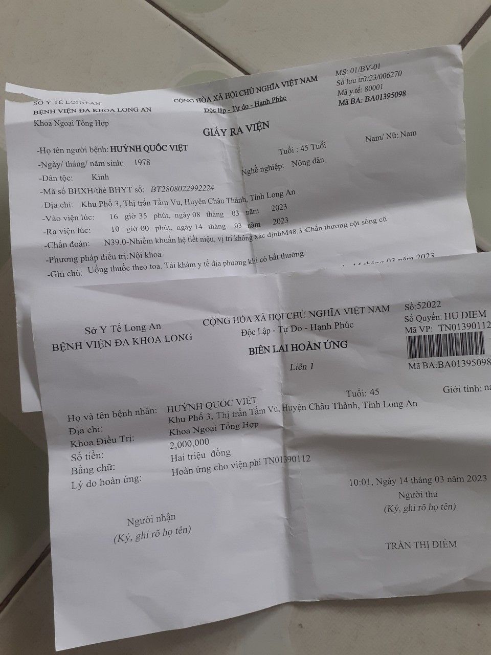 Cháu có hình ảnh giấy nhập viện, xuất viện cũng như đơn thuốc của bác sĩ lần nằm viện này không ?
