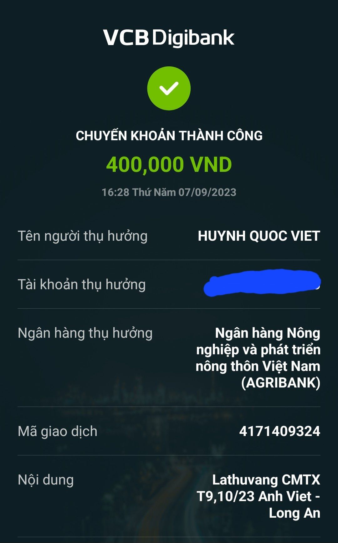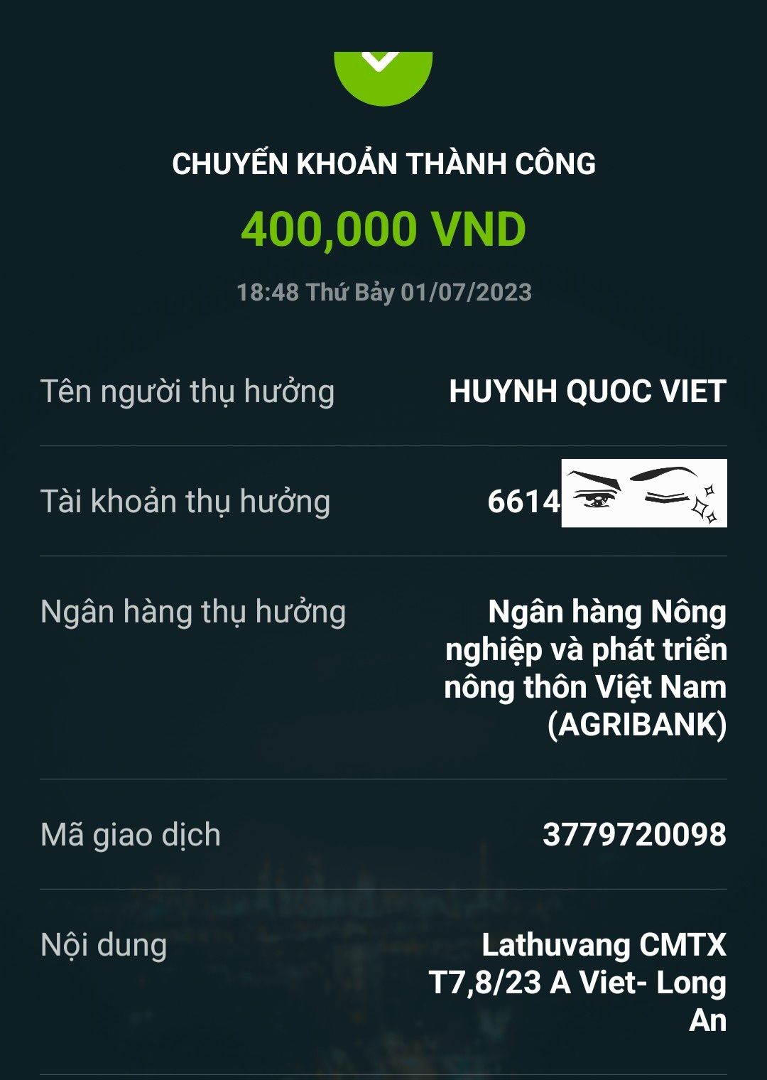 Lathuvang đã chuyển tk Anh Việt CMTX T7,8/23. Mong anh luôn khỏe.