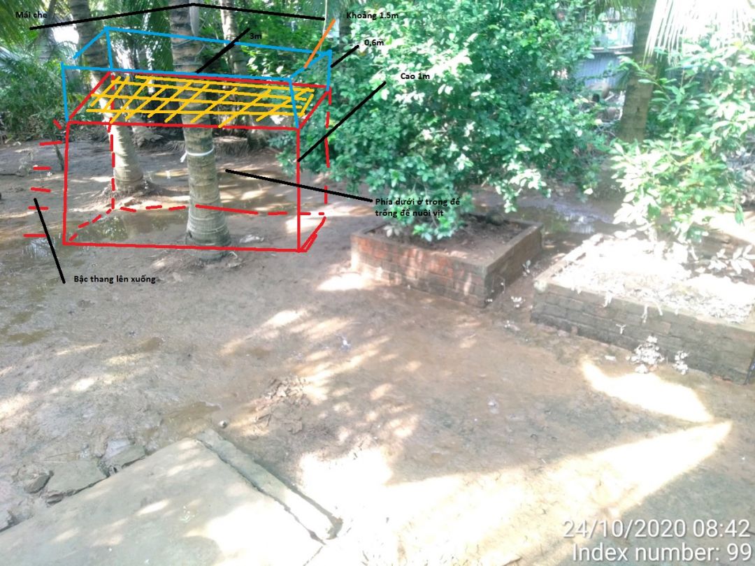 Do khi mưa lớn hay bị ngập nên xây cao khoảng 1m hình chữ nhật phía dưới để trống để trong giai đoạn nuôi vịt xiêm thì tối lại cho vịt xiêm ở trong phía dưới và làm bậc tam cấp đi lên.