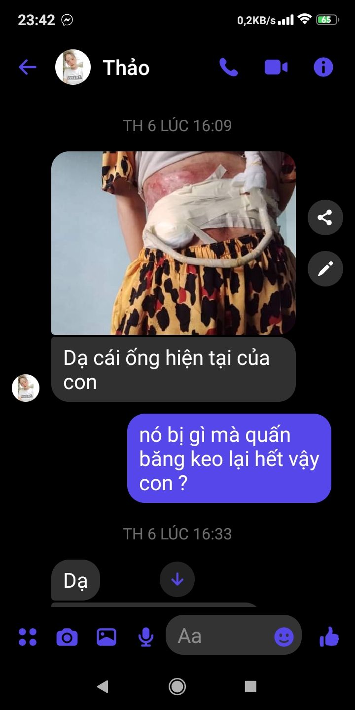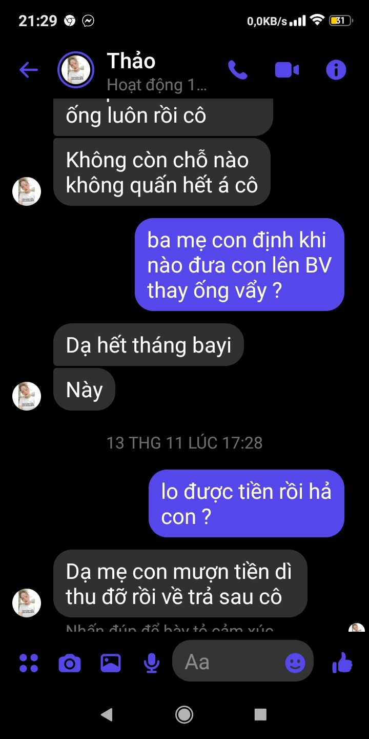 hôm thứ sáu vừa rồi Mai Trâm có nhận điện thoại trên messenger của em Thảo nhờ Mai Trâm tìm việc làm giúp để em có tiền phụ gia đình đưa Em đi lên bệnh viện chợ rẫy thay ống dẫn thức ăn gì hiện tại ống dẫn thức ăn của em đã bị vỡ gần 1 tháng nay. em tâm sự với Mai Trâm thấy mẹ đi vay tiền cho em hai ống. nên em muốn có công việc nào làm được có tiền để giúp gia đình.