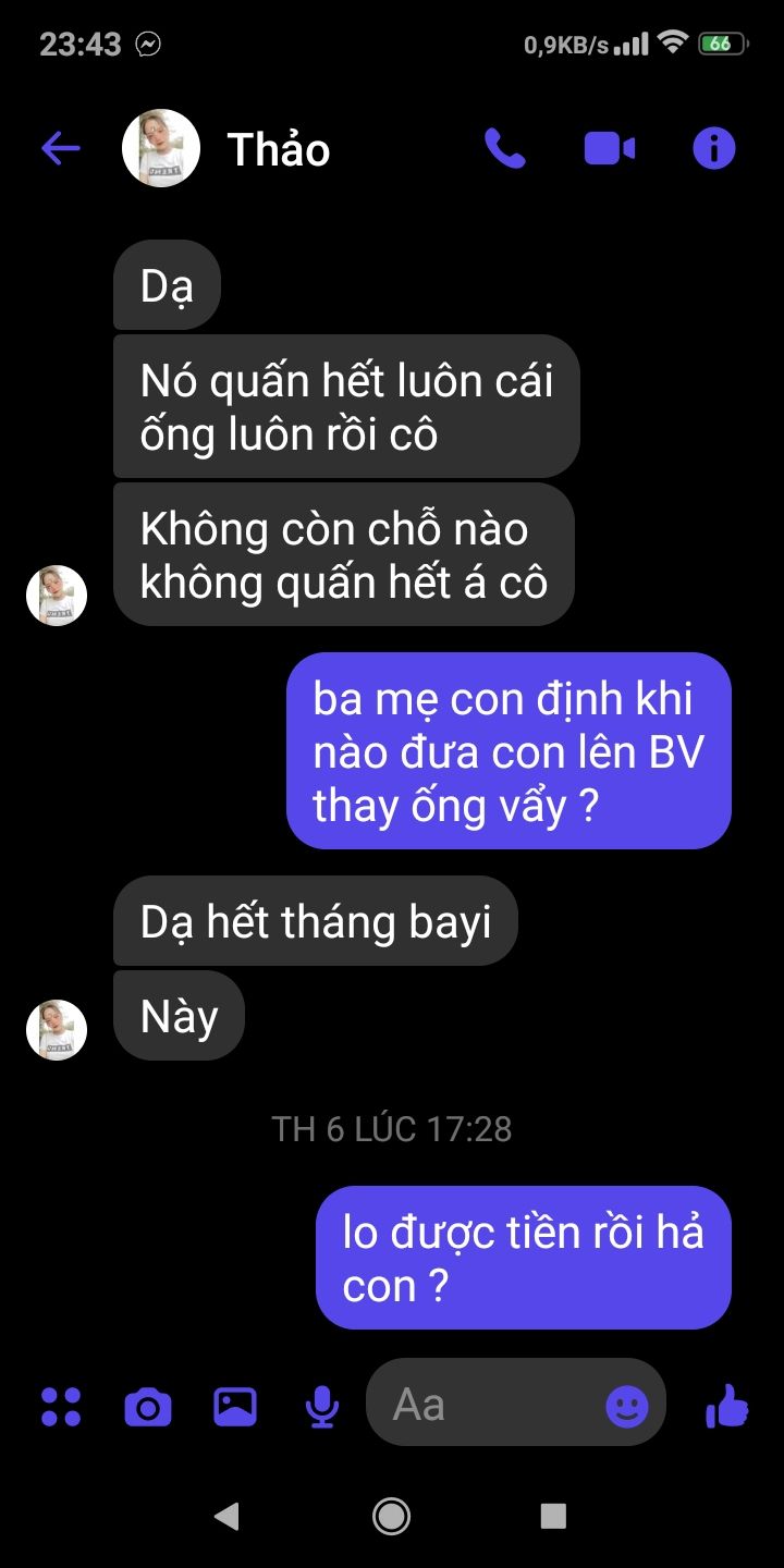 Lúc 4h chiều nay Mai Trâm có điện thoại hỏi thăm việc thay ống dẫn thức ăn cho Em Thảo được tiến hành chưa .