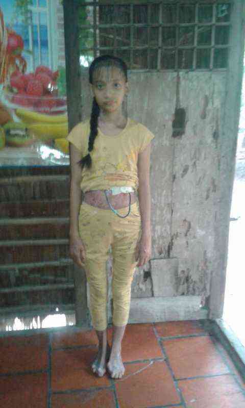 -Hiện bé đang nằm ở giường số 37, phòng 6, lầu 4 khoa Ngoại Tiêu Hóa bệnh viện Chợ Rẫy.Bé Thanh Thảo đã được chuyển vào viện hơn 1 tháng do hẹp thực quản ăn uống rất khó. Sau thời gian điều trị ở bệnh viện tỉnh bé đã được điều trị vượt tuyến lên bệnh viện Chợ Rẫy.Do ăn uống rất khó khăn trong hơn 1 tháng qua nên bé gầy đi rất nhiều.Tuy học rất giỏi nhưng bệnh nên việc học bị bỏ dở. Sau thời gian bé ăn không được nên thứ 2 vừa rồi bệnh viện tiến hành phẫu thuật đặt ống thông dạ dày thưc quản để bơm trực tiếp thức ăn xay nhuyễn, ca phẫu thuật kéo dài từ tối hôm trước đến gần sáng hôm sau. Hiện bé đang được truyền thức ăn và truyền nước tại bệnh viện.