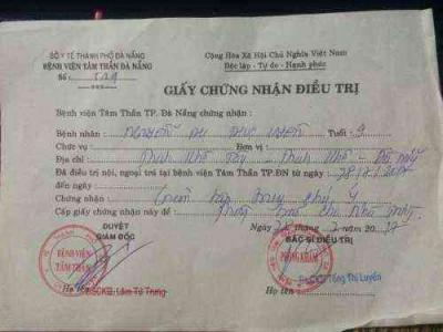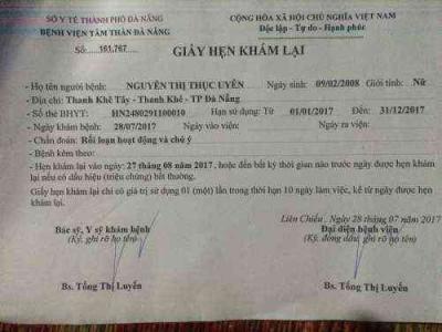 Giấy chứng nhận để thông báo cho nhà trường về tình trạng của bé của BV Tâm Thần Đà Nẵng