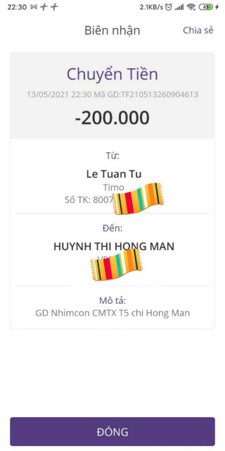 Cảm ơn anh/chị, mình đã kiểm tra ngân hàng thì bị lỗi lệnh chuyển hàng tháng từ tháng 1-5/2023 nên đã chuyển lại cho chị Mẫn. Từ tháng 6 tiền CMTX tiếp tục được chuyển bình thường.